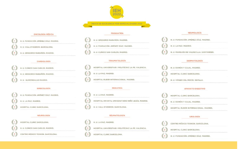 El resto de los centros lo hacen con una especialidad, con el Hospital Clínico San Carlos liderando Cardiología, el Hospital Universitario Ramón y Cajal la especialidad de Dermatología; el Hospital Universitario Gregorio Marañón con Psiquiatría, el Centro Médico Teknon en Urología, y el Hospital Universitari i Politecnic La Fe de València la Traumatología.