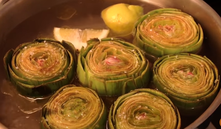 Luego de cortar la base de las alcachofas para que se mantengan en pie y también de haberlas tratado para evitar que se pongan negras, es momento de llevarlas a cocción para solo entonces después de esta poder rellenarlas.