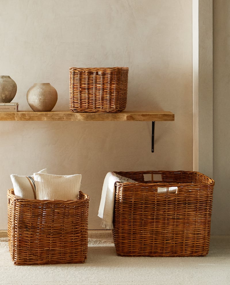 El ratán es la fibra de la palmera, que una vez seca y tratada se usa para trenzar objetos decorativos como esta bonita cesta de Zara. Además de ser prácticas para la decoración de cualquier espacio en el hogar, aportan un toque de decoración natural y acogedor. Se puede elegir entre tres tamaños diferentes y a distinto precio. La más pequeña mide 30x36x36cm y está rebajada a 29,99€ y la más grande tiene unas medidas de 46x 63x63 cm y el precio es de 59,99 €. Están hechas a mano, así que cada pieza es única.