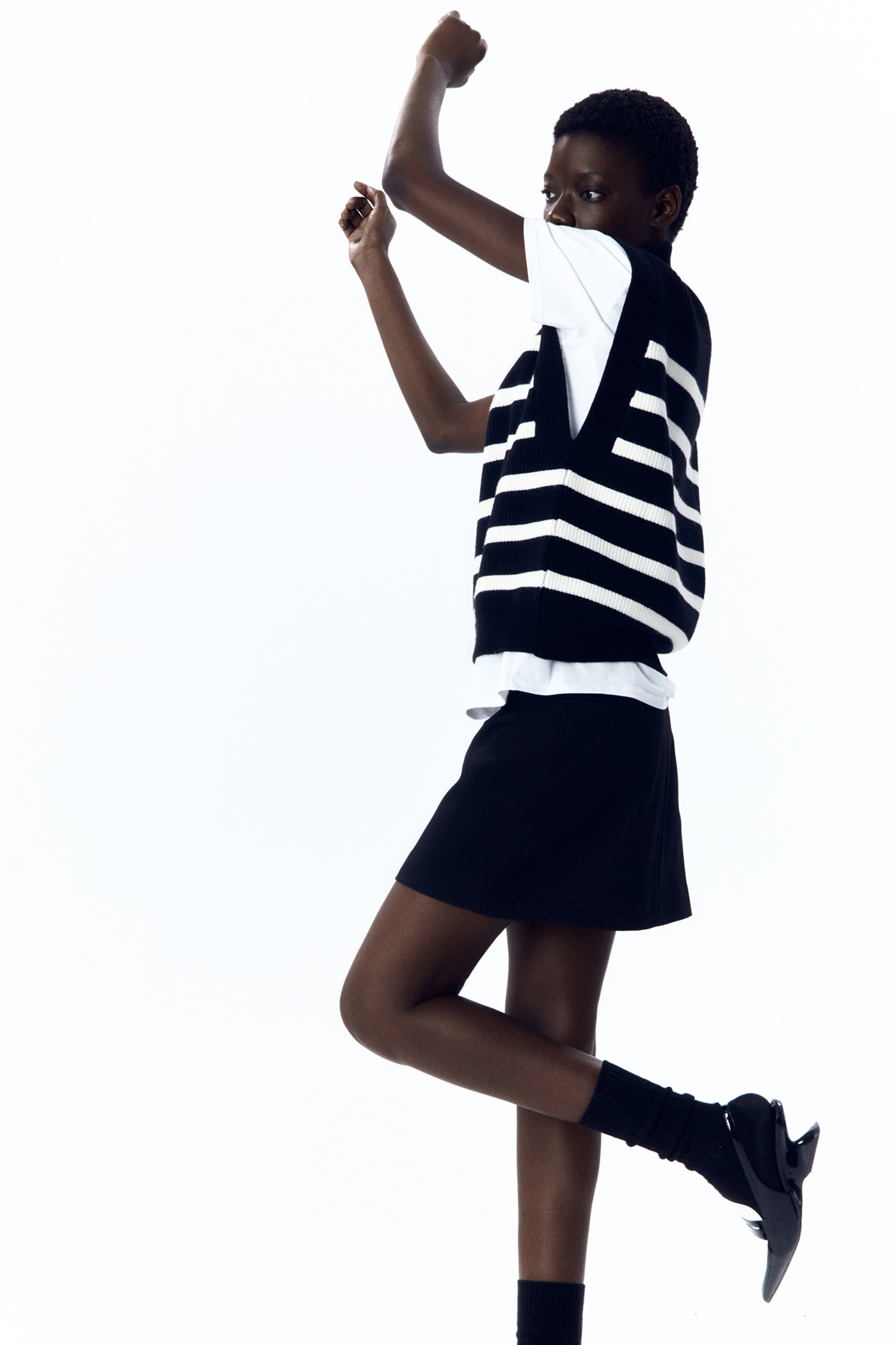 El chaleco de punto a rayas de Sfera es una prenda versátil y cómoda, ideal para completar tu atuendo en cualquier ocasión. Confeccionado en suave lana, cuenta con un diseño de rayas horizontales en tonos neutrales que lo hacen fácil de combinar con cualquier prenda.