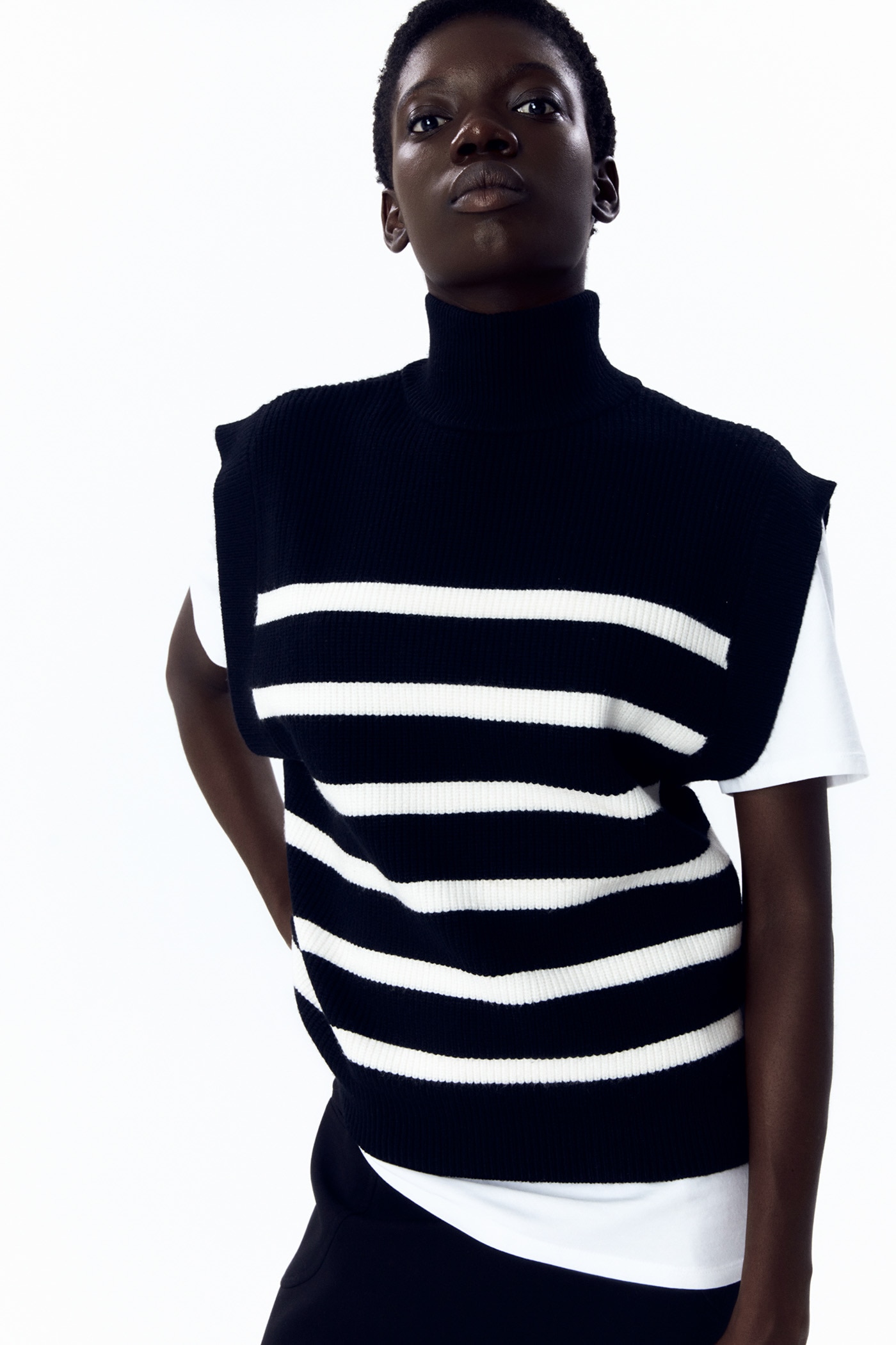 El chaleco de punto a rayas de Sfera es una prenda versátil y cómoda, ideal para completar tu atuendo en cualquier ocasión. Confeccionado en suave lana, cuenta con un diseño de rayas horizontales en tonos neutrales que lo hacen fácil de combinar con cualquier prenda.