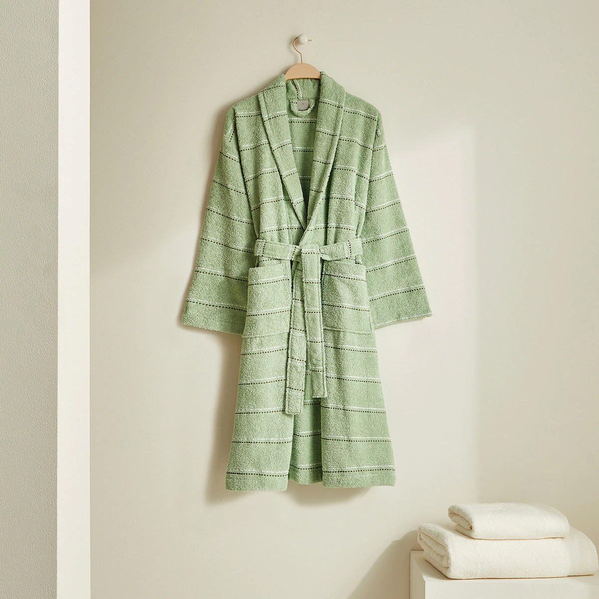 ¡Este albornoz es perfecto para ti! Con una solapa y diseño de rayas a contraste, tiene un acabado en rizo que lo hace único. Está confeccionado en algodón 100% de 360 gr/m2, lo que significa que es suave al tacto, absorbente y resistente.