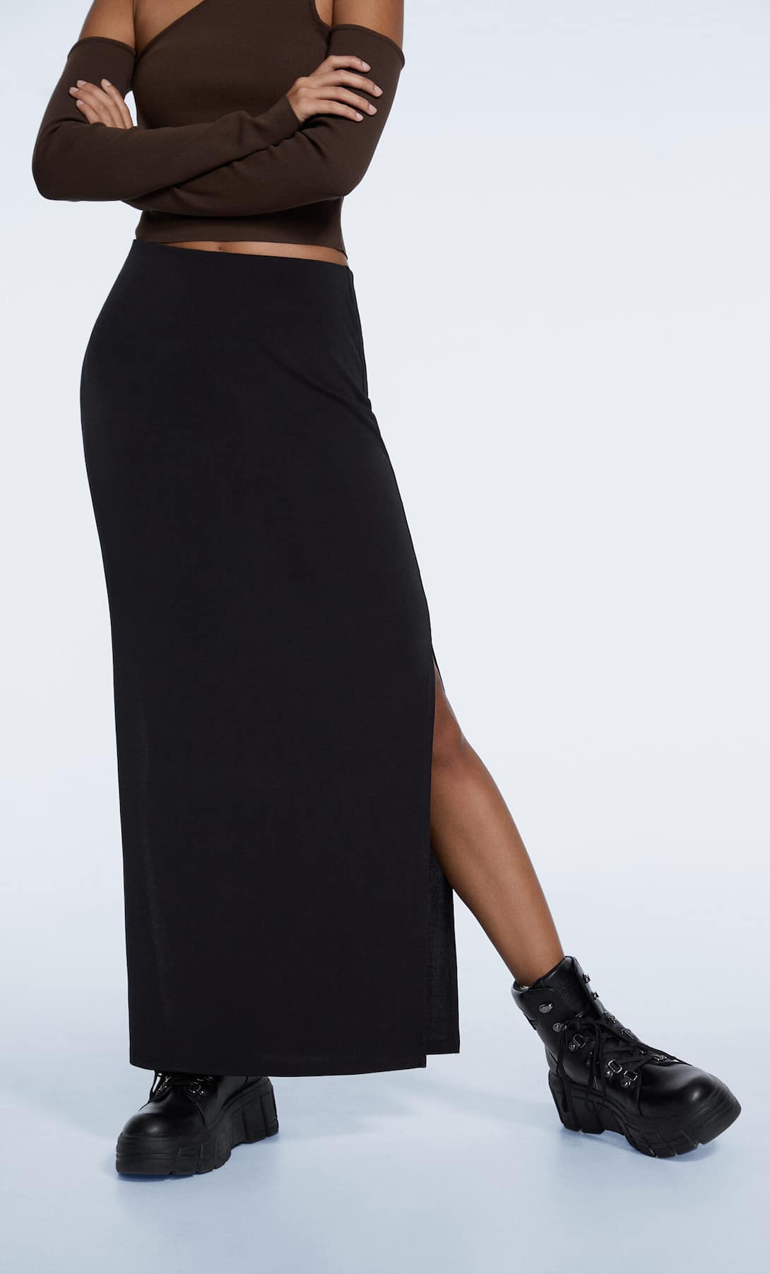 La falda midi es una prenda elegante y versátil con cintura elástica para un ajuste cómodo. Viene con un detalle de abertura en el bajo que le aporta un toque moderno y atrevido. Está disponible en varios colores para adaptarse a diferentes estilos y ocasiones. Con tallas desde la XS hasta la XL esta falda se adapta a diferentes tipos de cuerpo. Su precio es de 15,99 €.