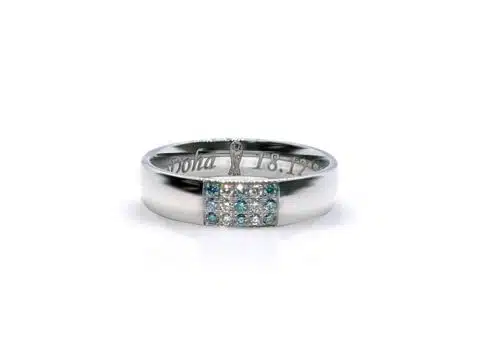 Por otra parte, este anillo conmemorativo presenta 3 filas de diamantes azul celeste y 2 filas de diamantes clásicos con un corte brillante, debido a que se trata de una edición especial. En cuanto a sus dimensiones, el anillo conmemorativo mide 4,5 mm de ancho por 1,50 mm de alto y cuenta con un certificado Responsible Jewellery Council (RCJ).