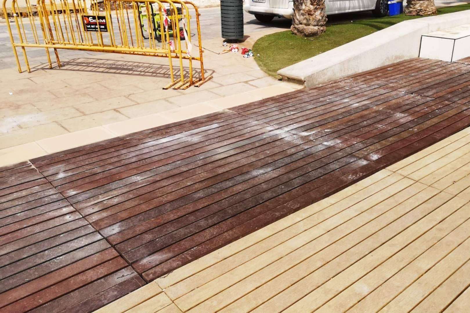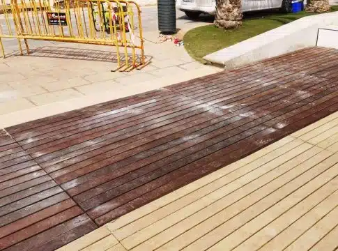 Por otro lado, el acabado de las pasarelas se distingue como una imitación muy realista de la madera natural, lo cual aporta un mayor atractivo.