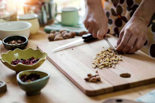 Seguimos con el paso a paso de la receta de tarta de chocolate. Ahora toca elegir los toppings que queremos añadir a la masa, pero si no quieres, puedes optar por no añadir nada. Jordi Cruz optó por añadir nueces y bolitas de chocolate. Cortamos las nueces pequeñas y las reservamos. No te vayas y sigue leyendo, que continuamos contando cómo preparar este exquisito postre.