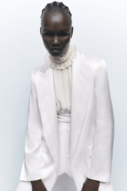 Para finalizar con los mejores blazers que hemos encontrado para copiar el look de Tamara Falcó, traemos para ti este en color blanco satinado que está de lujo y que llevas a un precio magnífico de tan solo 19,99 euros.
