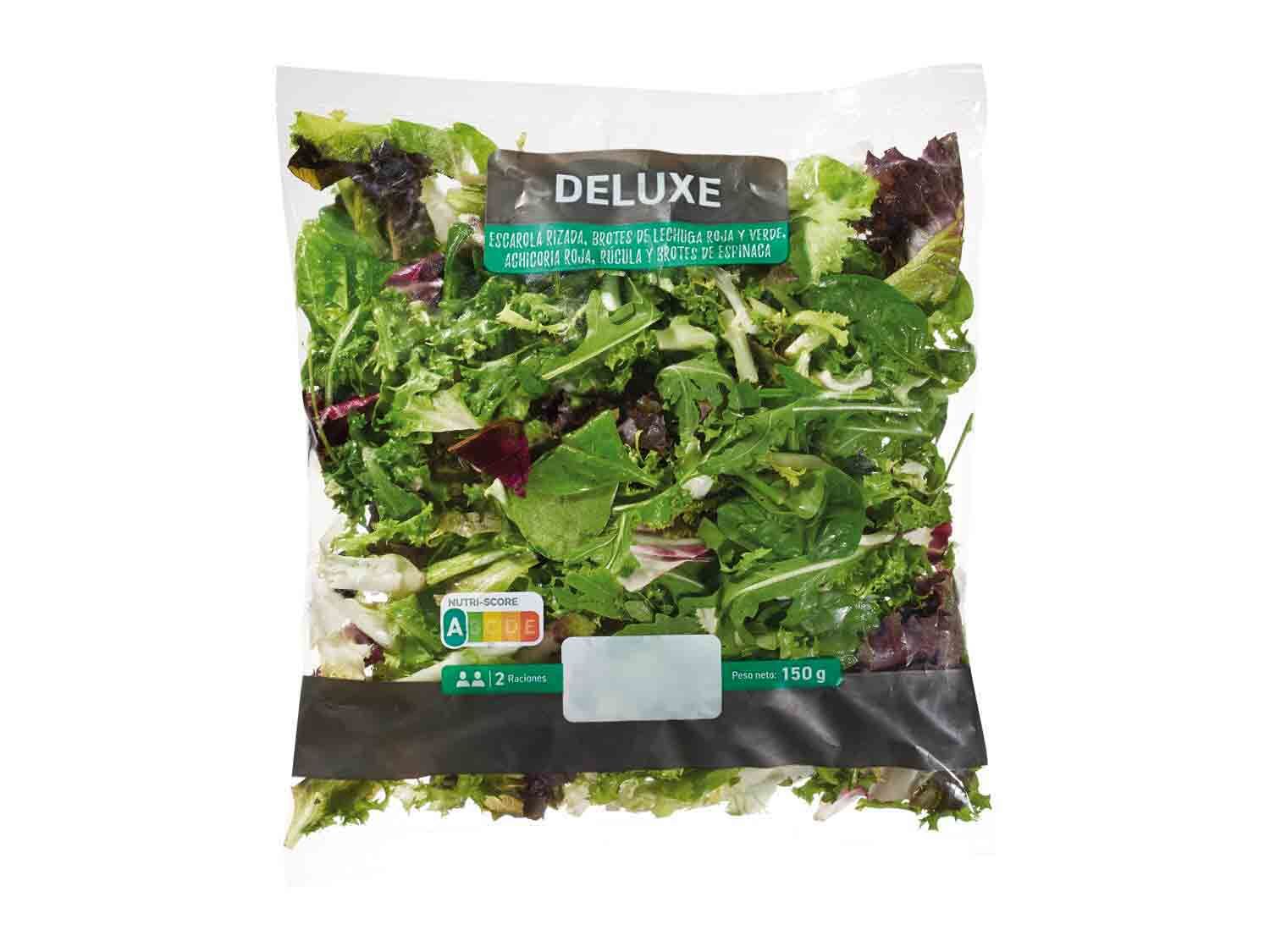 Este paquete de ensalada deluxe contiene 150g, lo que es suficiente para dos raciones. Se encuentra en oferta por solo 0.85 euros, un descuento del 14% sobre su precio original de 0.99 euros.