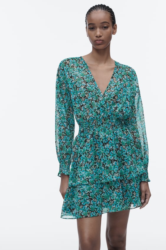 Este vestido corto es una opción ideal para un look cómodo y elegante. Con su escote pico cruzado y manga larga, favorece a cualquier tipo de cuerpo. Además, cuenta con una cintura elástica ancha que acentúa la figura y un bajo acabado con volantes que le da un toque divertido. El forro interior asegura una comodidad óptima. El precio de este vestido es de 35,95 EUR.