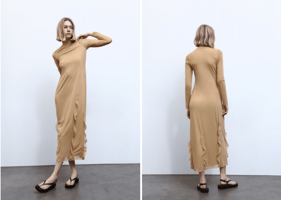 Si buscas un vestido cómodo, elegante, perfecto para usarlo de una manera práctica y que puedas combinar con diferentes tipos de calzado y accesorios según la ocasión, este que consigues en Zara confeccionado en tul de color camel, es el que te va a enamorar.