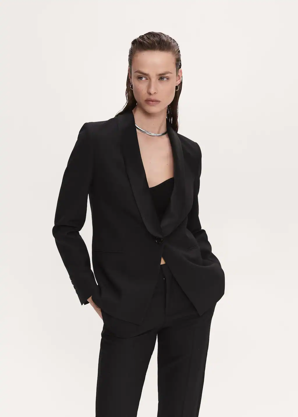 Confeccionada con una mezcla de lana de alta calidad, esta americana te brinda un estilo traje refinado y moderno. Sus solapas satinadas y cierre de botón le dan un toque de glamour y elegancia, mientras que sus bolsillos decorativos agregan un detalle extra de estilo.