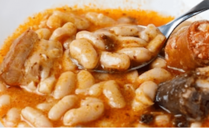 Cuando estén en la olla, las alubias, el chorizo, panceta y morcilla, además de estar sazonado con un suculento sofrito, solo falta agregar el caldo de pollo para terminar la cocción de la fabada asturiana.