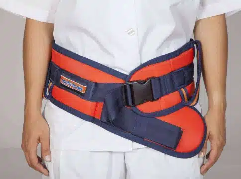 Entre las soluciones ofrecidas, se encuentra el cinturón de movilización, un dispositivo clave para terapeutas y cuidadores en las tareas de transferencia de pacientes de forma segura y controlada, reduciendo al mínimo el riesgo de lesiones del cuidador y del paciente.