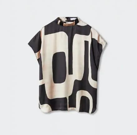Echa un vistazo a esta blusa estampada con cuello alto de Mango. Está hecha de un tejido satinado y fluido para una sensación de lujo en cualquier ocasión. El estampado abstracto añade un toque único y moderno.