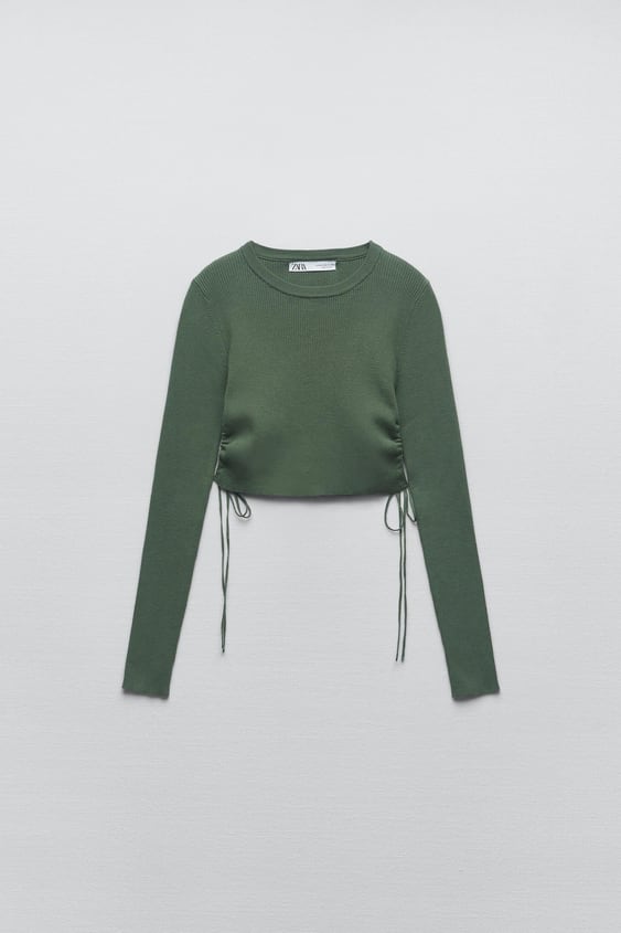 ¡Resalta tu figura con este elegante Top Cropped de Zara! Esta prenda de diseño moderno cuenta con cuello redondo y manga larga, más aberturas laterales con una hermosa lazada. Esta prenda es perfecta para llevar con jeans o falda para un look informal o con una falda midi para un look más sofisticado.