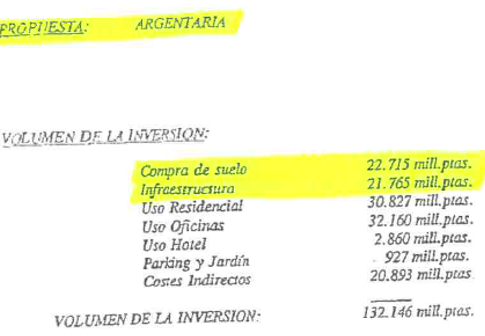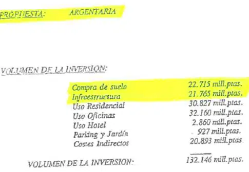 Pero en medio de este tumulto, surgió un caso singular. Un caso que desconcertó a muchos y que, a día de hoy, sigue siendo un misterio. En julio de 1994, se firmó el contrato de adjudicación con el Banco público Argentaria (posteriormente fusionada con BBV), la única oferta que incluía una partida de inversión destinada a la compra del suelo, por importe superior a la destinada para la inversión en infraestructuras y la única oferta que se hacía cargo y asumía todos los costes y gestiones relacionados con las compensaciones a los reversionistas.