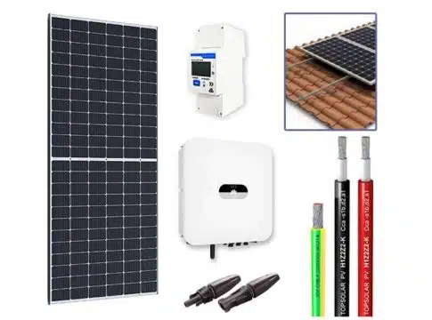En líneas generales, un kit solar sin almacenamiento está compuesto por 4 componentes fundamentales. Los primeros son las placas o paneles solares que sirven para transformar la radiación emitida por el Sol en energía eléctrica. Estos paneles se fijan en el tejado o en la cubierta con una estructura de fijación o soporte. Cuando el tejado tiene una inclinación óptima, se pueden usar los soportes coplanares que respetan la estética de la casa y además permiten una buena inclinación para captar la luz solar. Si no es el caso, existen soportes de hormigón que proporcionan la inclinación necesaria para cubiertas planas. Posteriormente, el inversor solar es un componente sumamente importante que muchas veces se pasa por alto. Es el responsable de transformar la energía continua que generan los paneles solares en energía alterna para el hogar o local comercial. También es el controlador de todo el sistema, ya que junto con el medidor de energía, es el que proporciona los datos de la generación de la planta, el consumo total del hogar de la planta y de la red eléctrica. Estos datos se pueden monitorizar a tiempo real desde la aplicación móvil que ofrece el fabricante. Antes de comprar el inversor, hay que saber qué tensión necesita el suministro, tensión monofásica o trifásica.
