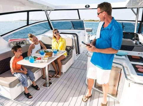 Otra opción de la línea Sport es el Aquila 32. Con un nuevo diseño y múltiples innovaciones en el interior, el barco es ideal para el desarrollo de múltiples aventuras acuáticas, debido al alto estilo, potencia, calidad y rendimiento. Así como el Aquila 36 todos ellos equipados con motor fuera borda
