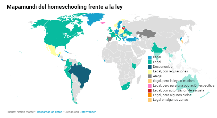 España está muy lejos de países como Estados Unidos, donde dos millones de niños se forman en el hogar al margen del sistema habitual, o en otros como Reino Unido, Francia y Canadá. Mientras que en estos países está perfectamente regulado, en España hay, como decíamos, una laguna legal que sin embargo no prohíbe esta opción. Lo que más sorprende son algunos de los países donde es ilegal, muy abiertos en casi todos los temas, como Suecia, Países Bajos o Alemania.