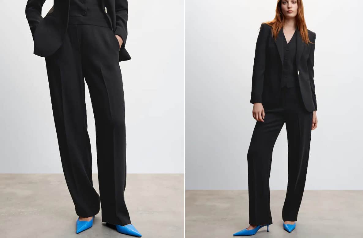 Este tipo de pantalón se caracteriza por su corte recto y su pierna ancha que se abre en forma de A desde la cadera hasta el tobillo. Suelen estar confeccionados en tejidos suaves y fluidos como el crepé o la seda, que caen con elegancia y le dan al pantalón un movimiento suave y natural. En cuanto a los diseños, Mango ofrece una amplia variedad de modelos de pantalón traje de pierna ancha en diferentes colores y estilos. Puedes encontrar desde versiones más clásicas en tonos neutros como el negro o el gris hasta opciones más atrevidas en tonos brillantes o con estampados.