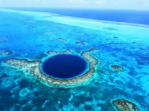 A su alrededor se aprecian arrecifes de tonalidades turquesas que le dan aún más encanto a la postal. El Gran Agujero Azul es un sumidero situado en pleno mar de Belice. El agujero, cuya profundidad actual es de 123 metros, era la entrada a un sistema de cuevas calizas en la última Edad de Hielo.