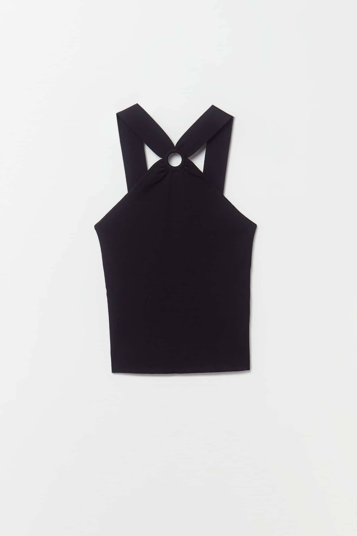 Está hecho con un tejido suave y cómodo para que te sientas como en casa. Esta pieza es perfecta para tus looks nocturnos y de día. Disfruta de esta pieza versátil a un precio de 19,99 €. ¡Agrega un toque de estilo a tu look con nuestro top de tirantes con anilla delantera!