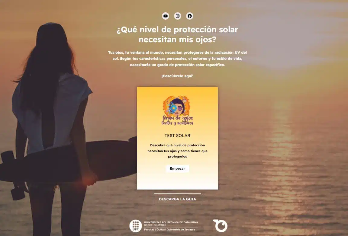 Esta herramienta gratuita, desarrollada por Visión y Vida con el apoyo de la Facultad de Óptica de Terrasa y AEO (Asociación Española de Fabricantes de Óptica), ayuda al usuario a conocer qué filtro solar necesitan acorde con su estilo de vida y necesidades visuales
