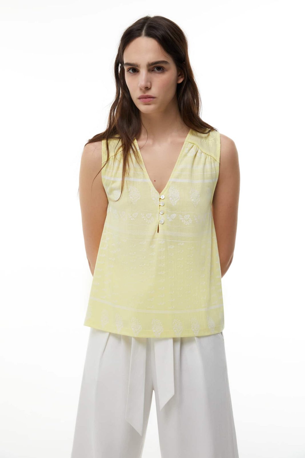 ¡Luce moderna y llena de estilo con esta camiseta jacquard estampada de tirantes de Sfera! Esta camiseta es perfecta para lucir en cualquier ocasión informal, ya sea para una reunión con amigos, una cita informal con tu pareja, una fiesta en la playa, en fin, a donde quieras. Esta camiseta es muy cómoda de llevar, está realizada en tejido suave con detalle de frunce y cierre de botones. ¡No puedes perderte esta camiseta a un precio irresistible de 9,99 €!