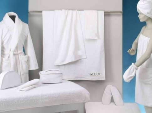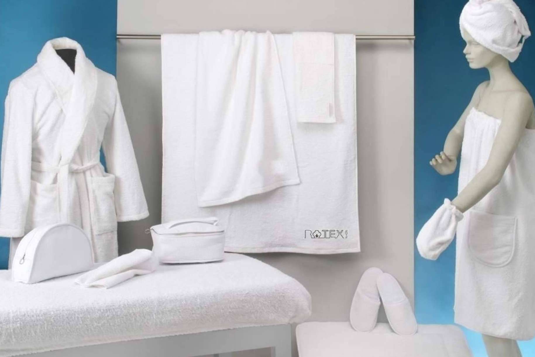 Todo centro de estética u hotel necesita de la excelente materia prima del Grupo Rotex para su spa: manoplas, patucos y turbantes de rizo, fundas de camilla ajustables, sabanas con agujero facial, albornoces, toallas y toallones blancos o de diferentes colores a elección. Además, la empresa es especialista en la creación, confección personalizada y diseño de toallas encimeras para este tipo de negocios.