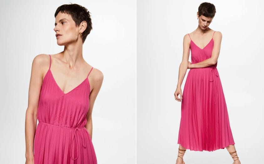 Este vestido plisado con cinturón en color fucsia de Mango puede ser una opción vibrante y femenina para una ocasión especial o una salida casual. Los pliegues en el vestido pueden agregar textura y volumen, lo que puede hacer que la prenda sea más interesante visualmente y agregue movimiento al vestido. El color fucsia es una elección audaz y llamativa que puede aportar una gran cantidad de energía y vitalidad a cualquier atuendo. Este tono vibrante puede hacer que el vestido se destaque y llame la atención, lo que lo convierte en una excelente opción para un evento o una fiesta en el que desees lucir radiante. Puede ser tuyo por tan solo 15,99 euros.