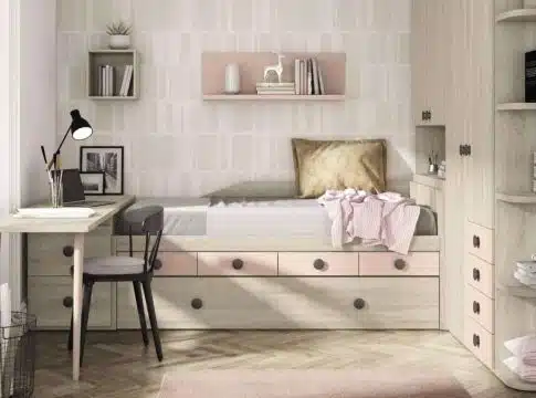Unos elementos muy demandados por los compradores en la actualidad son las camas compactas o las camas nido. La posibilidad de convertir la parte interior de la cama en un espacio de almacenaje extra ayuda a optimizar el espacio, un aspecto crucial en las nuevas construcciones. Por otro lado, los estantes y librerías modulares también aportan funcionalidad a toda la habitación.