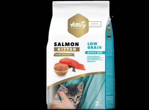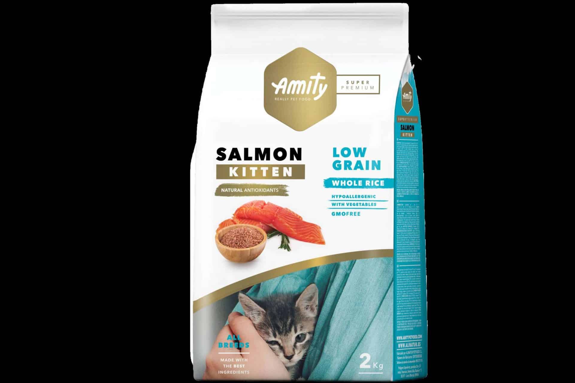 Amity Super Premium está disponible en sabor salmón que es una fuente natural de ácidos grasos Omega 3 y 6, que actúan directamente sobre el sistema inmunológico, nervioso, cardiovascular y en general mejoran el metabolismo del gato. También se distingue según la etapa vital o el formato: Se encuentran en formato de 2 kg para la etapa Kitten (hasta los 12 meses) y en formato de 2 y 7 kg tanto para gatos adultos como para gatos adultos esterilizados.