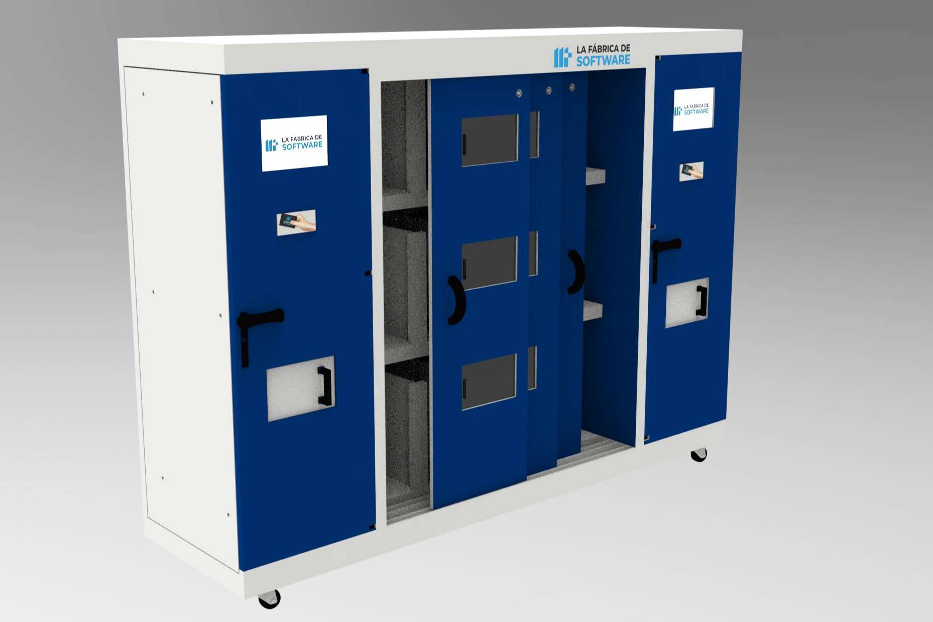Una de las soluciones más destacadas de La Fábrica de Software es el sistema de gestión eficiente de ropa hospitalaria. Está elaborado con tecnología de punta, y se centra en el control de vestuario profesional. Además, cada una de sus partes ofrece un servicio disponible durante las 24 horas del día y conectividad permanente, lo que garantiza el acceso a información en línea sobre el estado de las máquinas, niveles de stock, notificaciones de carga, entre otro tipo de cuestiones. En este camino, el sistema está integrado por dispensadora de uniformes, dispensadora de almacén rotativo, armario UHF para dispensación de zuecos, taquillas inteligentes, recolectora de uniformes, y túnel UHF de lectura masiva.