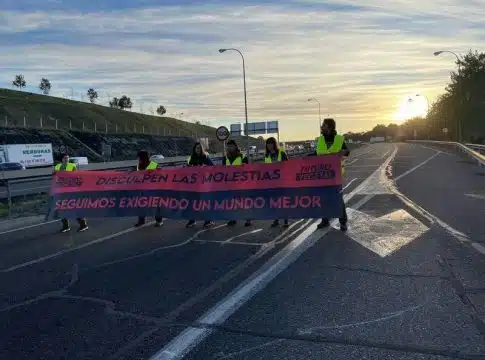 Activistas de la organización Futuro Vegetal han protagonizado este martes una nueva acción de protesta con el corte de la vía de acceso a MercaMadrid, provocando retenciones en la M40. Los miembros de futuro vegetal portaban una pancarta en la que se podía leer "Disculpen las molestias. Seguimos exigiendo un mundo mejor".