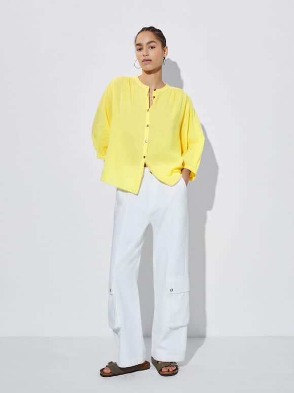 Te presento una camisa confeccionada en tejido 100% algodón de Parfois, ideal para cualquier ocasión. Su estructura es rígida y cuenta con una manga larga abullonada, que le da un toque sofisticado y elegante. El cuello es redondo y el cierre delantero se realiza mediante botones. Todo esto a un precio muy accesible de 22.99€. ¡Aprovecha esta oportunidad y consigue una prenda de calidad para tu armario!