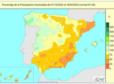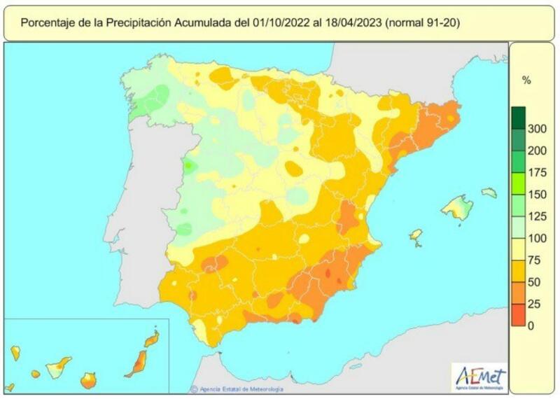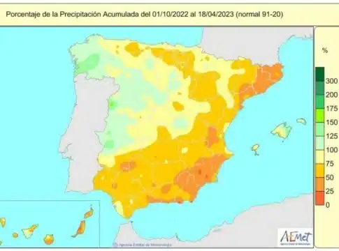 La falta de lluvias acumulada en España desde que el pasado 1 de octubre comenzó el año hidrológico hasta el 18 de abril alcanza el 23 por ciento, ya que se ha recogido un valor medio de 337 litros por metro cuadrado, cuando lo normal para este periodo serían 440 litros por metro cuadrado, según la Agencia Estatal de Meteorología (AEMET).