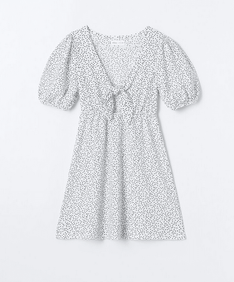 Este vestido corto es muy original gracias a su manga corta con forma abullonada y un escote en forma de pico con un lazo decorativo en el frontal. La falda tiene un poco de vuelo y el tejido es estampado por toda la prenda con diferentes motivos muy primaverales. Está confeccionado con un cómodo tejido hecho de poliéster y un 1% de elastano que le proporciona un ajuste perfecto. Se puede elegir entre tres colores y estampados diferentes. Llévatelo por 12,99 euros.
