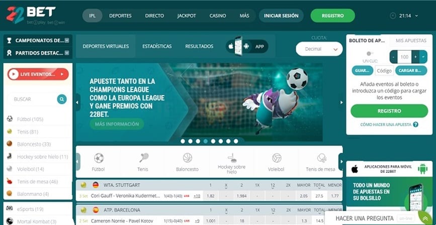 El diseño de la página web de 22Bet hace fácil encontrar cualquier juegocon comodidad. El único elemento discordante es la larga lista de deportes situada a la izquierda, algo difícil de manejar.