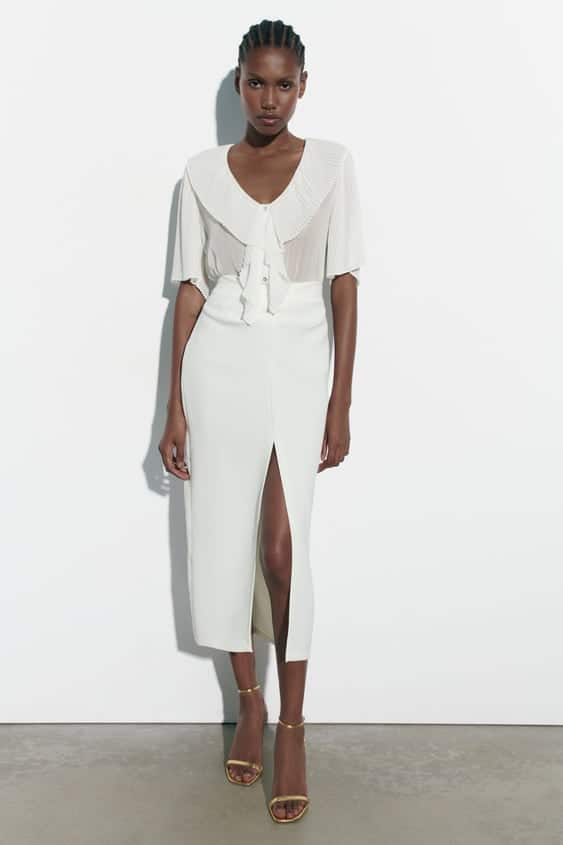 En resumen, la blusa volantes plisados de Zara es una opción muy acertada para cualquier mujer que busque una prenda elegante y sofisticada que se adapte a cualquier situación. Su diseño moderno y los detalles cuidadosamente confeccionados hacen que sea una prenda imprescindible para cualquier armario de moda.