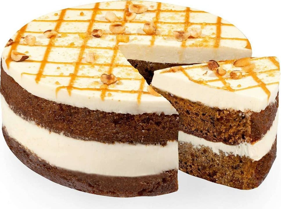 Este bizcocho de zanahoria con crema de queso es una delicia preparada con harina de trigo, zanahoria confitada, glucosa, queso crema, fermentos lácticos, leche desnatada en polvo, leche condensada y avellanas, entre otros ingredientes. Cada porción de 90 gramos aporta 343 kcal, 29 g de grasa, 36 g de hidratos de carbono, 1,1 g de fibra alimentaria, 4,7 g de proteínas y 0,66 g de sal.