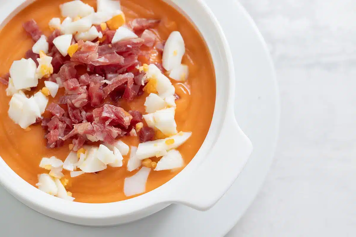 El salmorejo es un plato muy versátil que se puede acompañar de diversas formas. Una opción clásica es servirlo con huevo duro picado y jamón serrano en taquitos.