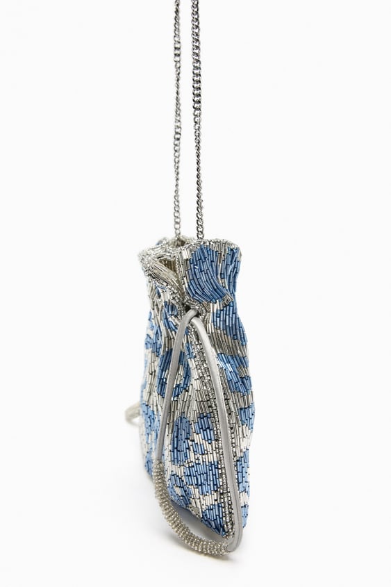 Repleto de abalorios y en un llamativo color plata con estampado en tonos azules, este bolso es todo un objeto de deseo para aquellas que buscan un accesorio llamativo y original.