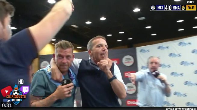 Por fortuna, Pedrerol logro tomar el control de la situación sentando a los provocadores; por su parte, Edu Aguirre, una vez que los empuja, vuelve a sentarse mientras observa como quedo eliminado el Real Madrid.