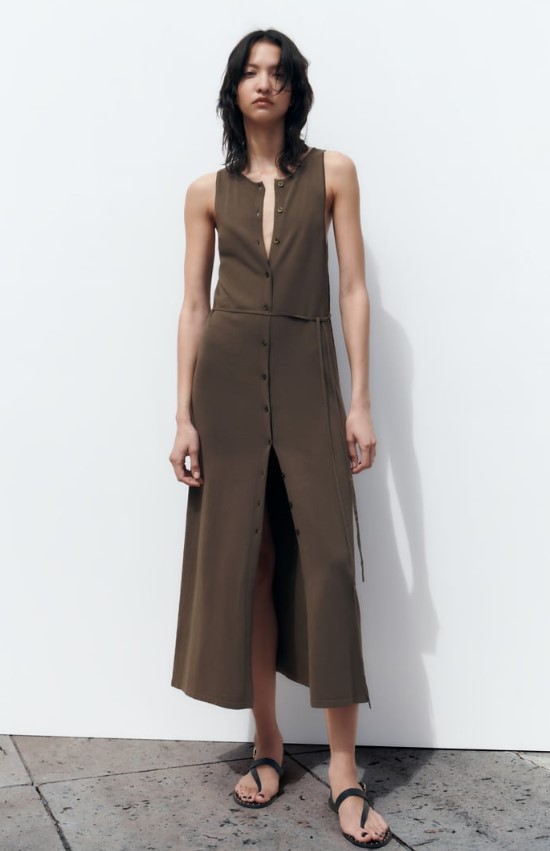 Este vestido de Zara es de estilo midi, lo que significa que tiene una longitud que llega aproximadamente a la mitad de la pantorrilla, ofreciendo una apariencia elegante y versátil. Está confeccionado en punto, un tejido suave y elástico que brinda comodidad y permite que el vestido se ajuste al cuerpo de manera favorecedora. El color predominante del vestido es kaki, un tono verde oliva que es versátil y fácil de combinar. Este color agrega un toque de sofisticación y estilo a la prenda. El vestido incluye un detalle de cinturón fino a tono, lo que permite definir la cintura y crear una silueta más estilizada. El cierre frontal del vestido se realiza mediante botones.