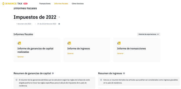 Binance Tax fue diseñada tras la creciente demanda de los usuarios de la compañía para disponer de una herramienta fácil de usar para conocer sus obligaciones en la plataforma con el fin de ayudarles a preparar y presentar sus impuestos y obligaciones fiscales. Los usuarios pueden acceder a un desglose de la actividad comercial iniciando sesión aquí con su cuenta de Binance. Una vez conectados, los usuarios pueden ver un historial de sus transacciones u operaciones, y las plusvalías e ingresos resultantes generados por su actividad. Asimismo, pueden descargar esta información en un informe de ganancias de: capital, ingresos o transacciones.