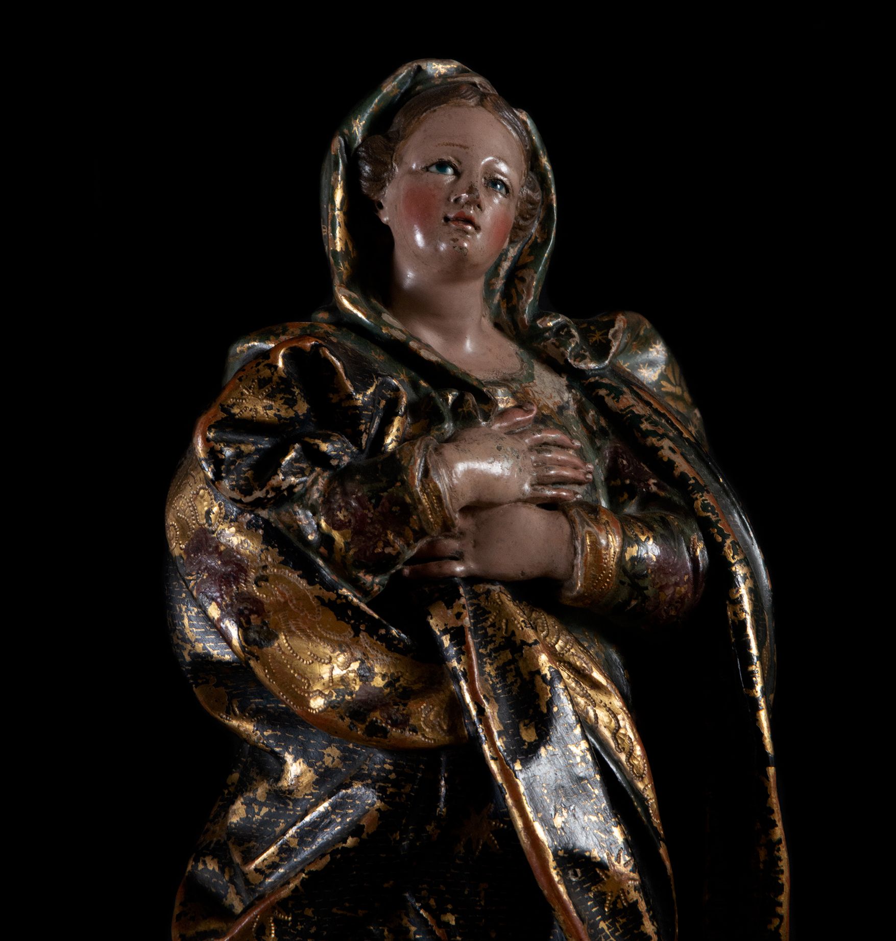 Los detalles de la obra ‘La Inmaculada de los ojos azules’ son excelsos, delicados y bellos. En ella, la Madre de Dios mira al cielo con un inocente gesto de ternura e inocencia bajo dos deslumbrantes ojos azules en cristal pintado como los que se conocen de varios modelos ejecutados por ‘La Roldana’. Su cuerpo está cubierto por un delicado manto verde dorado, puntillado y esgrafiado con bordes dorados cuajados de detalladas florituras de rosas pintadas. Bajo los pies de la Virgen Santísima, cinco risueños ángeles de inapelable factura miran al espectador con ternura. El grupo escultórico está realizado en terracota dorada y policromada conservando toda su policromía y dorados de origen y medidas de 43 x 23 x 14 cm.