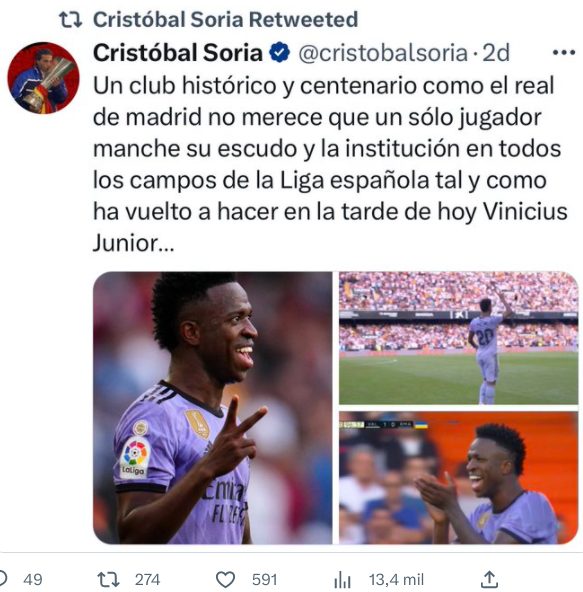 A pesar de que dice estar en contra de los hechos racistas, su permisividad con los colaboradores demuestran que los avala, bien sea por omisión o por mirar hacia otro lado hasta que el tertuliano suelte todas sus ofensas contra Vinicius. Solo entonces interviene para tratar de explicar que todo fue un malentendido.