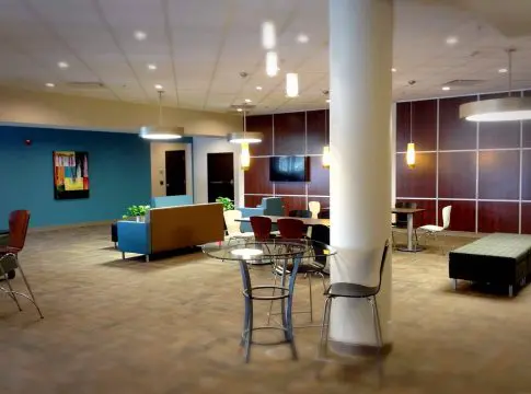 También las luces deben invitar al bienestar, la serenidad y el relax. Para ello, seleccionar colores cálidos con una intensidad moderada y evitar las zonas de penumbra. En lo posible, adaptar su presencia a los distintos usos de cada localización: puntos de lectura, zona de tertulia, área de equipos electrónicos...