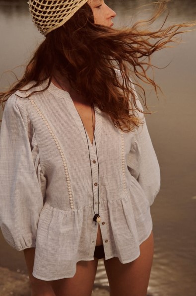 La camisa rayas de Zara es una prenda elegante y moderna que destaca por su estampado de rayas. Está confeccionada en un tejido ligero y cómodo, ideal para lucir en diversas ocasiones. Esta camisa cuenta con un cuello redondo que le proporciona un aspecto clásico y versátil. Además, presenta un escote en forma de pico, lo que agrega un toque de feminidad y estilo a la prenda. La manga larga de la camisa es abullonada, lo que le da un aspecto romántico y sofisticado. El precio: 26 euros.