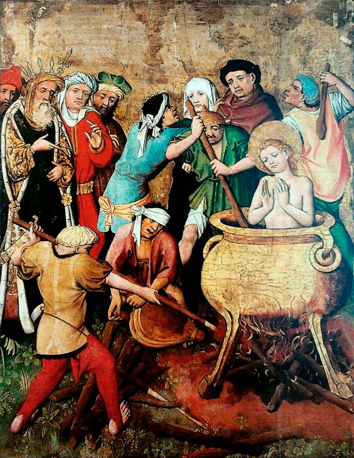 Finalmente, San Vito, Modesto y su ama de llaves, Crescencia, fueron condenados a muerte. Fueron arrojados a una caldera hirviendo de alquitrán y aceite, pero, según la tradición, un ángel los rescató y los transportó a una cueva donde finalmente murieron debido a la falta de alimentos y agua.